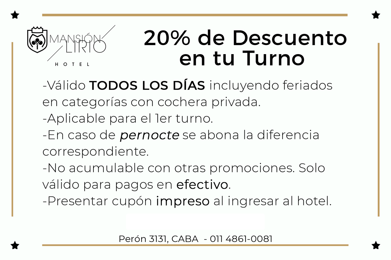 Presentá el cupón impreso al ingresar al hotel. Descuento solo disponible para pagos en efectivo.